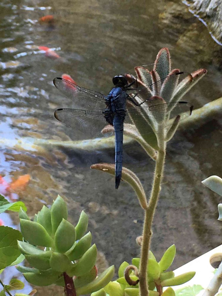 池にブルーのトンボさん😊