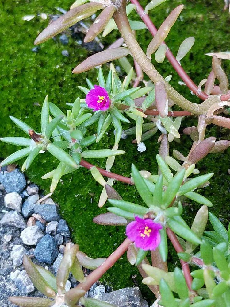 道端で、よく見かけます。観賞用のマツバボタンより、ずっと小さな、1㎝くらいの花です。苔盆栽風に見え、引かれました。