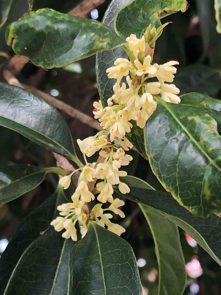 ほんのり甘い良い香りに誘われて、2.5m程の木に近づくと、各枝の葉の付け根辺りに集中するように、「銀木犀」(ギンモクセイ)の花とつぼみがついていました❣️