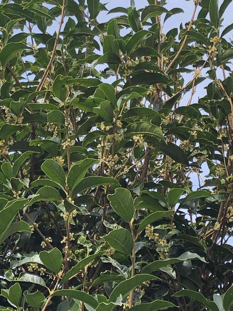 ほんのり甘い良い香りに誘われて、2.5m程の木に近づくと、各枝の葉の付け根辺りに集中するように、「銀木犀」(ギンモクセイ)の花とつぼみがついていました❣️