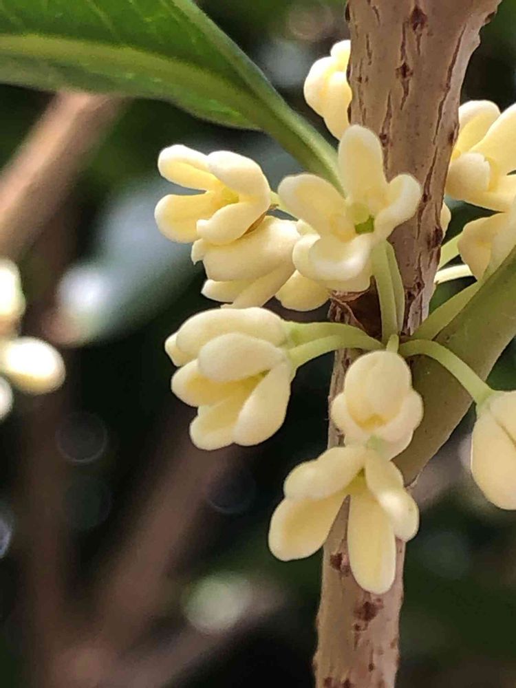 ほんのり甘い良い香りに誘われて、2.5m程の木に近づくと、各枝の葉の付け根辺りに集中するように、「銀木犀」(ギンモクセイ)の花とつぼみがついていました❣️