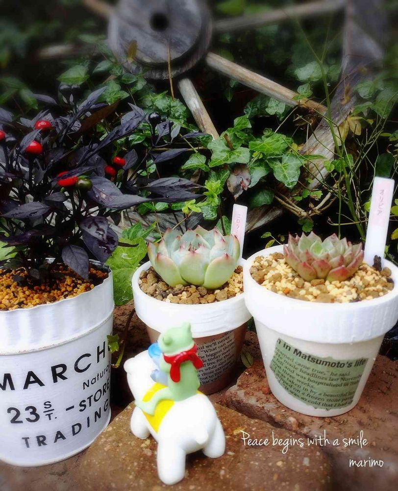 45さんの綺麗な韓国苗と、sueさんのリメ鉢♪*:₀.*❁*゚