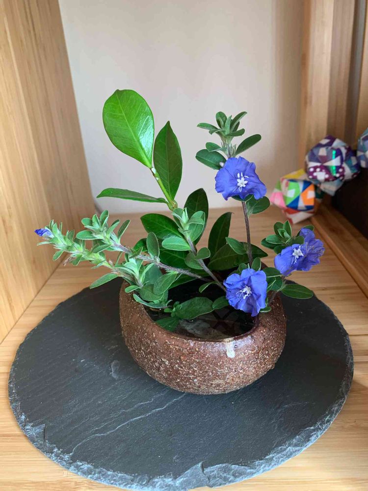 素敵なお花器ですね。お花とグリーンだけだとちょっと難しいアレンジです。テイカカズラの長さを思い切り短くして、アメリカンブルーの左の線をそのままきれいに見せるのもひとつの手です。またアメリカンブルーを主役にするなら目立たない小さな白か薄い黄色の花を低い位置に入れるとブルーが引き立ちます。お花じゃなければ、班入りの葉でもいいと思います。ただしテイカカズラはそのまま残し、違う形やサイズのグリーンを合わせます。