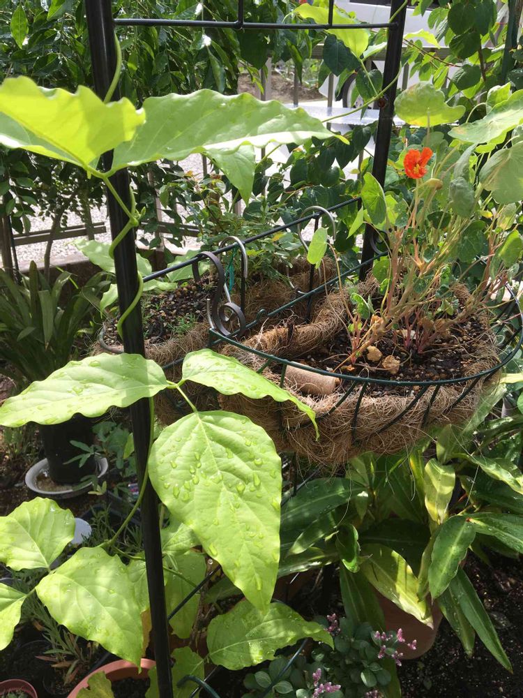 なた豆を育てています。鉢終えですが、今の所 順調です。鉢植えの月桃やっぱり鉢が小さくて根詰まりしてるみたいです。ナスタチュームは暑すぎて育たない?場所が悪いのかな?