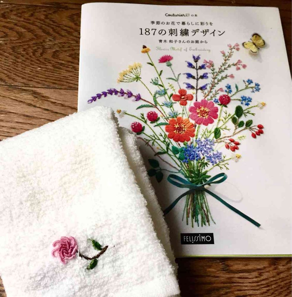 GS友に教えて頂いた刺繍の本に刺激され、何十年振りに白いタオルに薔薇を刺してみました🌿
