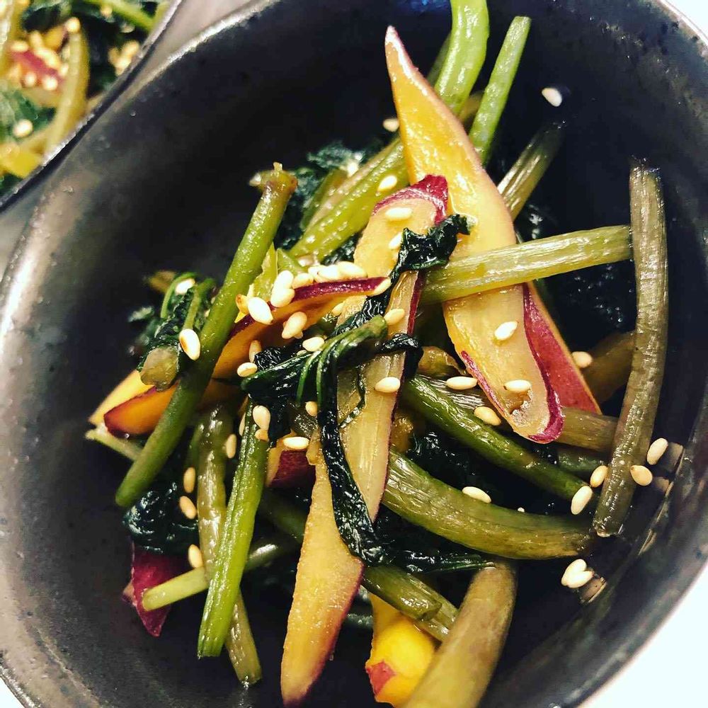 さつまいものツルのきんぴら、クズ芋入りで作ってみました。