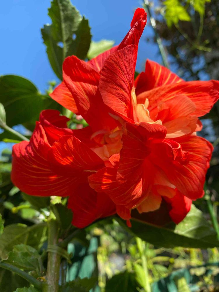 このハイビスカスは八重咲きで全体的にも大きく、その割に木がまだ細いので、ポールで支えてます😅