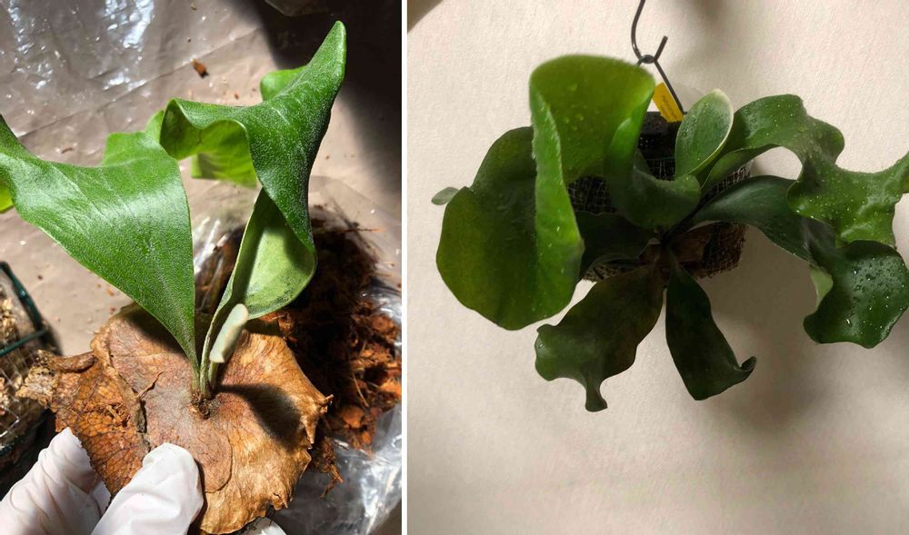 届いた時はちゃんと育てられるか不安でしたが、幸いヒリー系はビカクシダの中でも丈夫な方らしく、今年の酷暑で参ってしまう他のビカクシダ達を尻目に、虫の被害もなくベランダ放置でスクスク成長して、7ヶ月経った現在が写真右です。