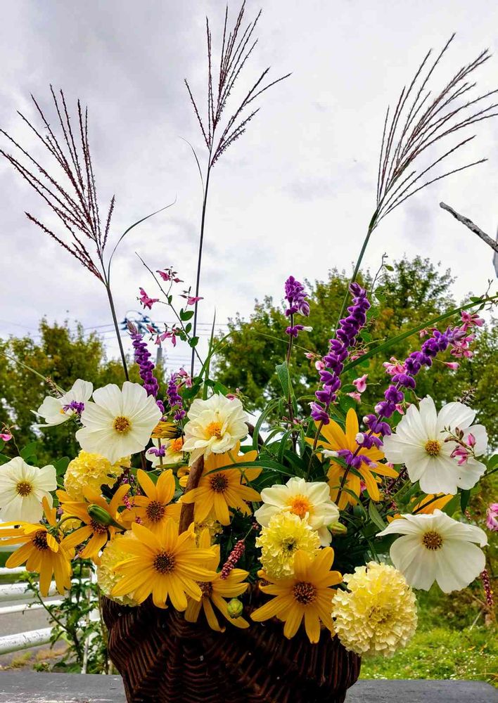 十五夜のアレンジメントを畑の菊芋の花で作ってみました。雲が多いから今夜はお月見出来るかな?
