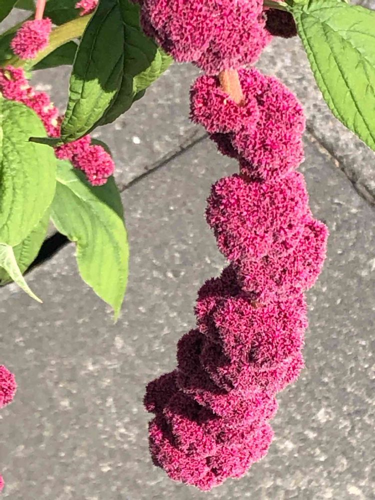 9月中旬.昼ご飯に立ち寄った、市内岡本付近の店先で、見事なまでに長く伸びた、赤紫のフサの様なおさげの花🌸を、沢山下げた、たぶん「ヒモゲイトウ」に、出会えました‼️