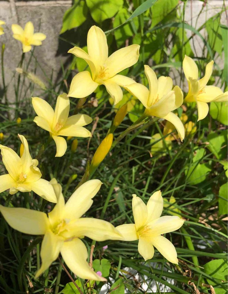 おはようございます。朝の散歩道。駐車場の片隅で黄色いゼフィランサスが。