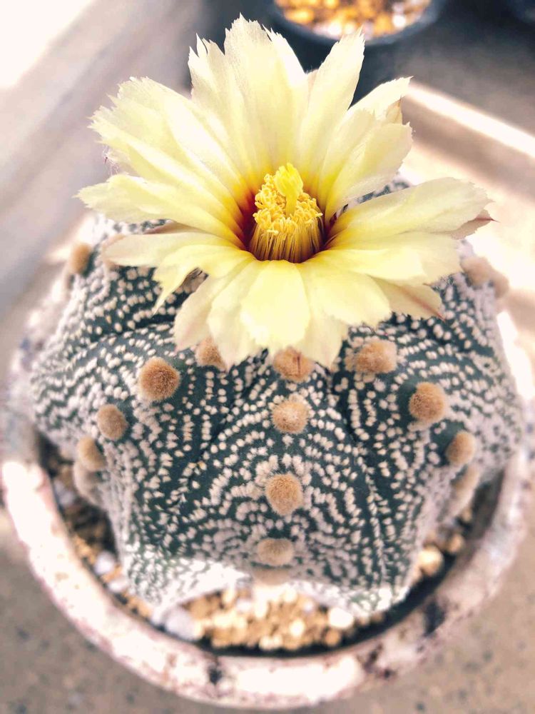 直径約12センチのビッグなヒトデ兜ちゃんのお花が咲きました〜🌼何回見てもサボテンのお花って可愛い〜✨