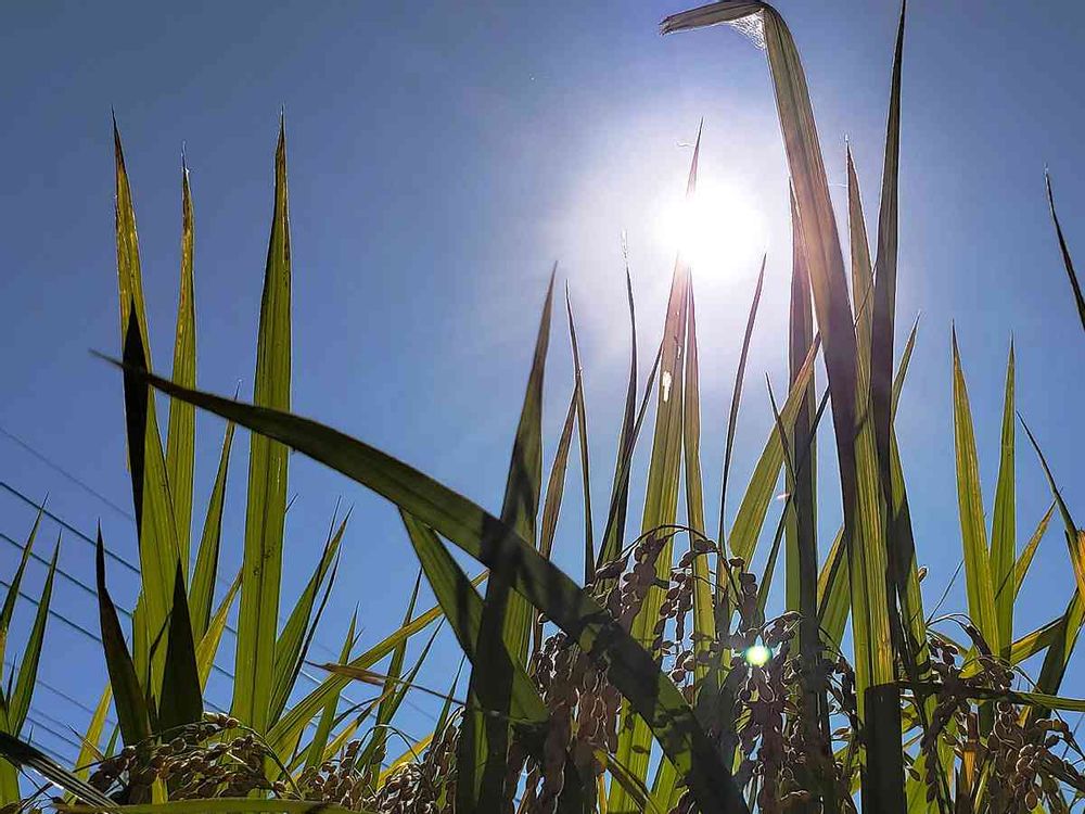 刈り取りを待つ田んぼの稲穂から望む...お日様。