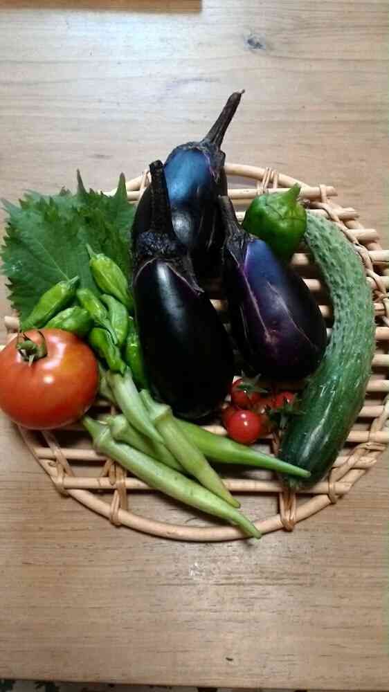 おはようございます😳今朝の収穫物です🍆初めてトマトが採れました🙌
