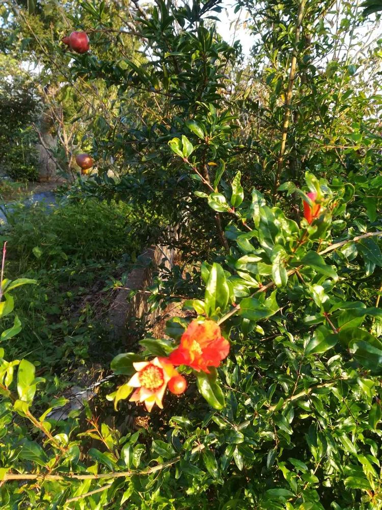 今ごろ、ザクロが花を咲かせています。もう実(左上に2個写っています)が熟し始めているというのに・・。