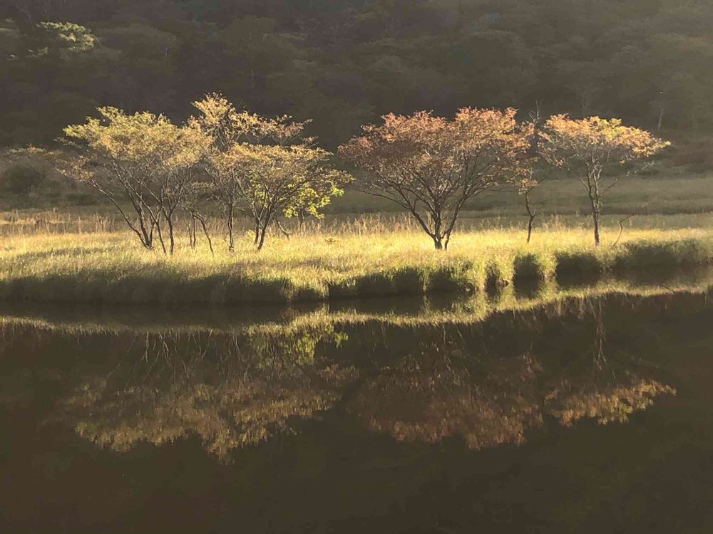 今朝 覚満淵の高層湿原に映える木々が水面に映り込み、朝日が射し込む光景を撮って来ました。