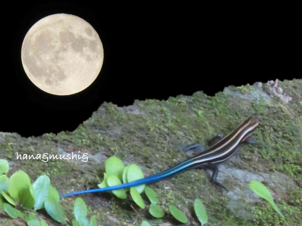 青く光るトカゲ🦎ちゃんが撮れたから、月とコラボしてみたくなりました🥰