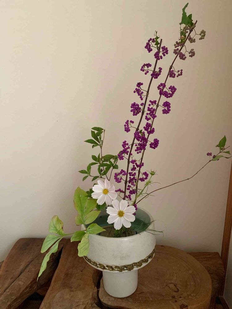 意匠的な作品ですね。花材の合わせが素敵です。ただコスモスの花二つ、紫式部が二本と分かれてしまう感がありました。コスモスをもう少し表情のある茎(曲がっているような)にするとか一本が開いていてもう一本は蕾とか。同じものを並べないほうが、紫式部が映えるのではと思います。