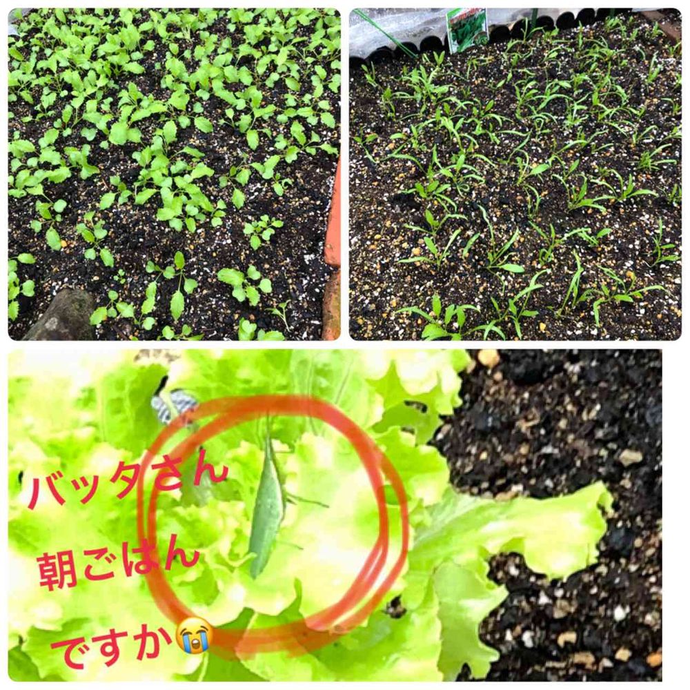 仕事に行く前に小カブとサラダほうれん草やレタスたちに水をたっぷり上げておはよぉって写メ撮ったら🦗❗