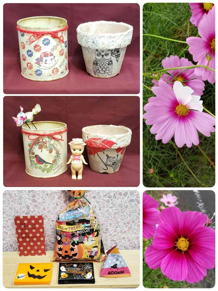 リメ鉢とリメ缶は、前も後ろも絵があって、2倍楽しめます。😊🎶