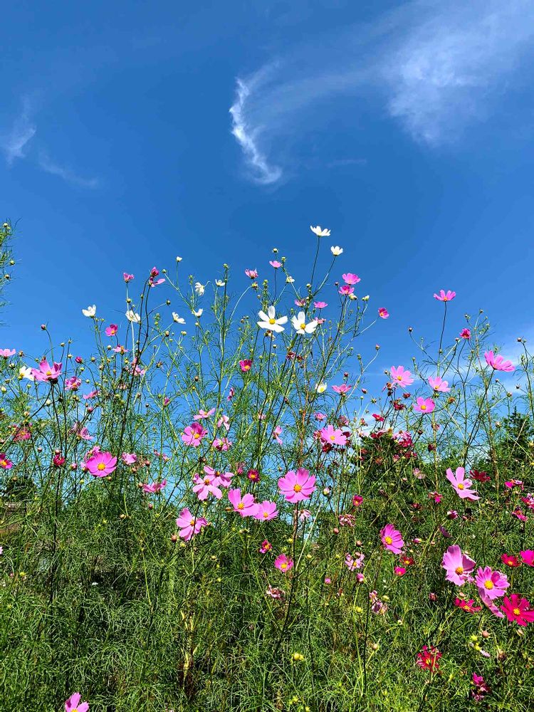 秋空に映えてます。コスモスがカラフルで、コントラストが最高です‼️