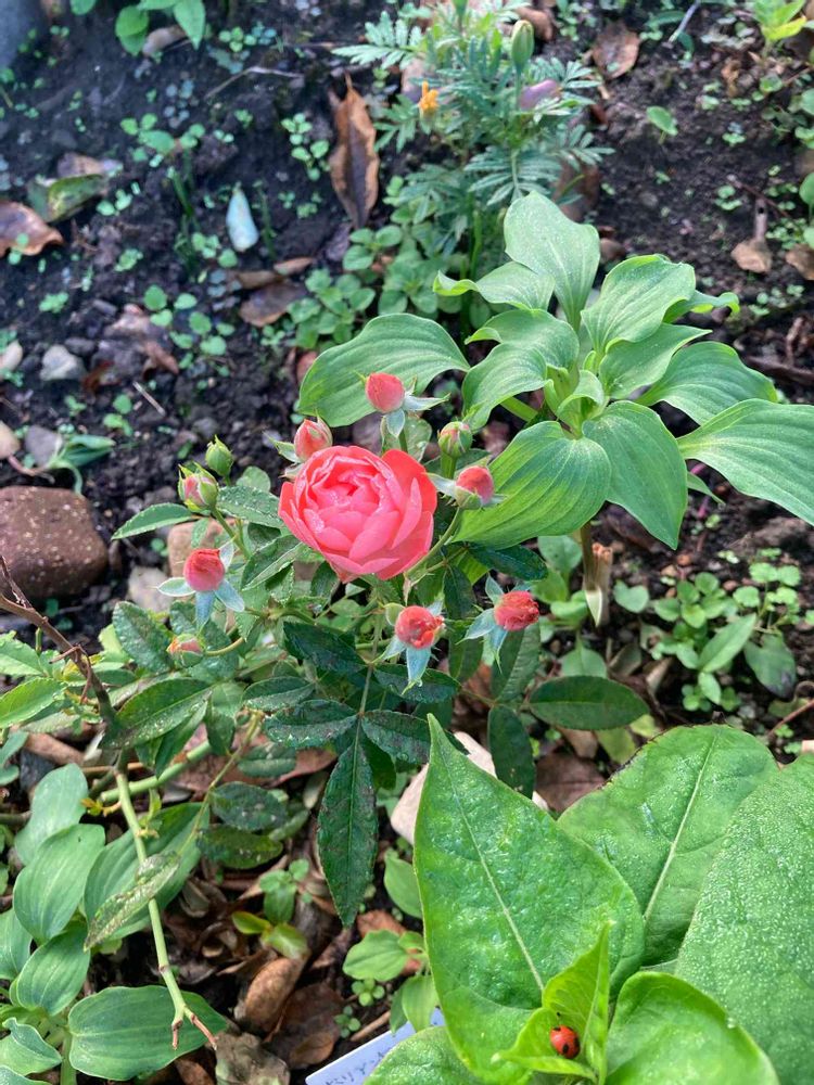 他の薔薇や紫陽花などの植え付けに必死で気づかなくてごめんね。サーモンピンク濃ゆめの色は、気持ちをほっこりさせてくれます。野いばらの一種でポリアンサローズの種類だと思います🌹左手には、薔薇のアバランチェの白が蕾をつけています。植えてから、まだ株の充実のために一度も咲かせていないけど、そろそろ一輪咲かせてみようかと思います。