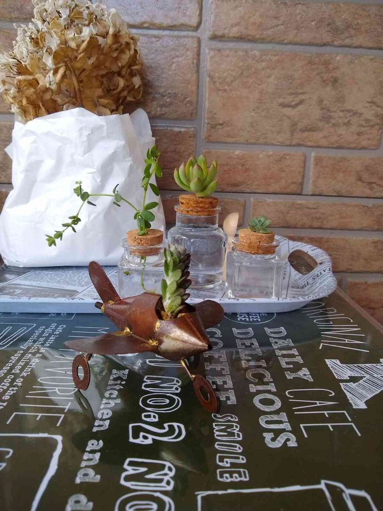 ブリキの飛行機に多肉パイロットが!?