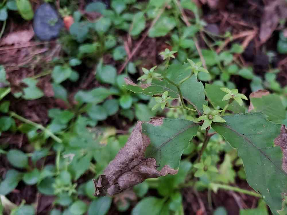 軽井沢の林の全く日当たりのない場所でみつけました。ツルで広がっています。花は終わったのか、これが花なのか?花は1cm、葉っぱは大きいもので8cm位、下の方の葉は丸みを帯びて小さいです。