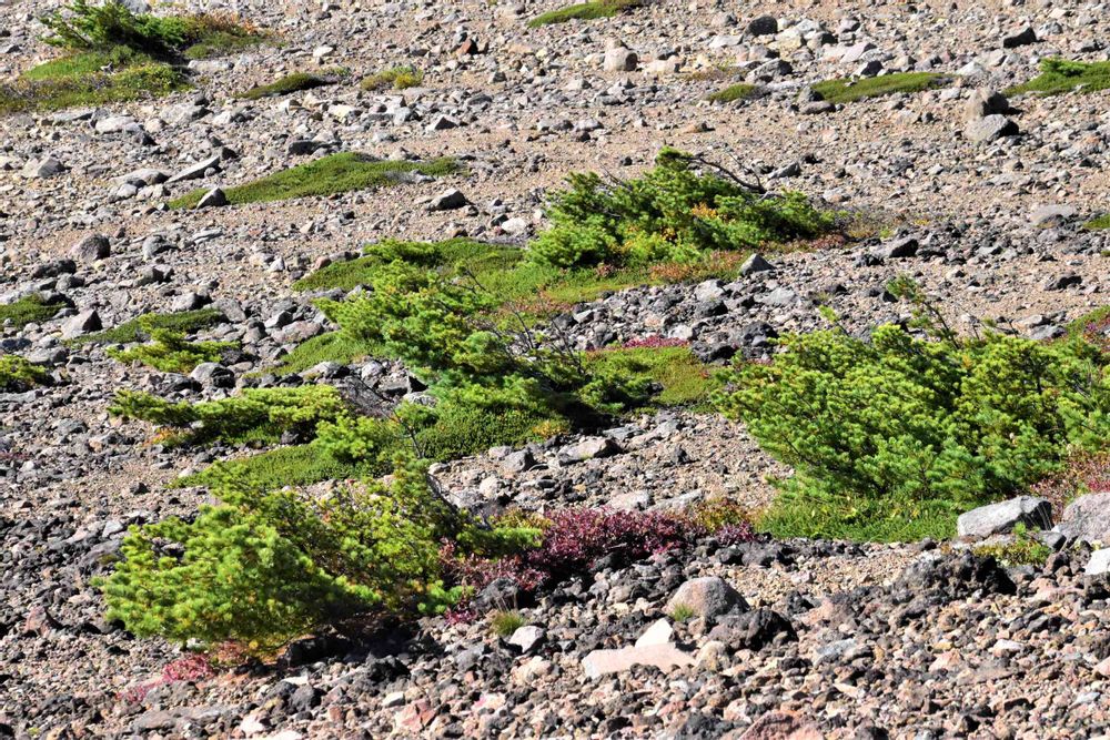 魔女の瞳を目に焼き付けて下ります。広〜い頂上は火山性の砂利で覆われてますが、そこに頑張って根付いてるハイマツさん達💚