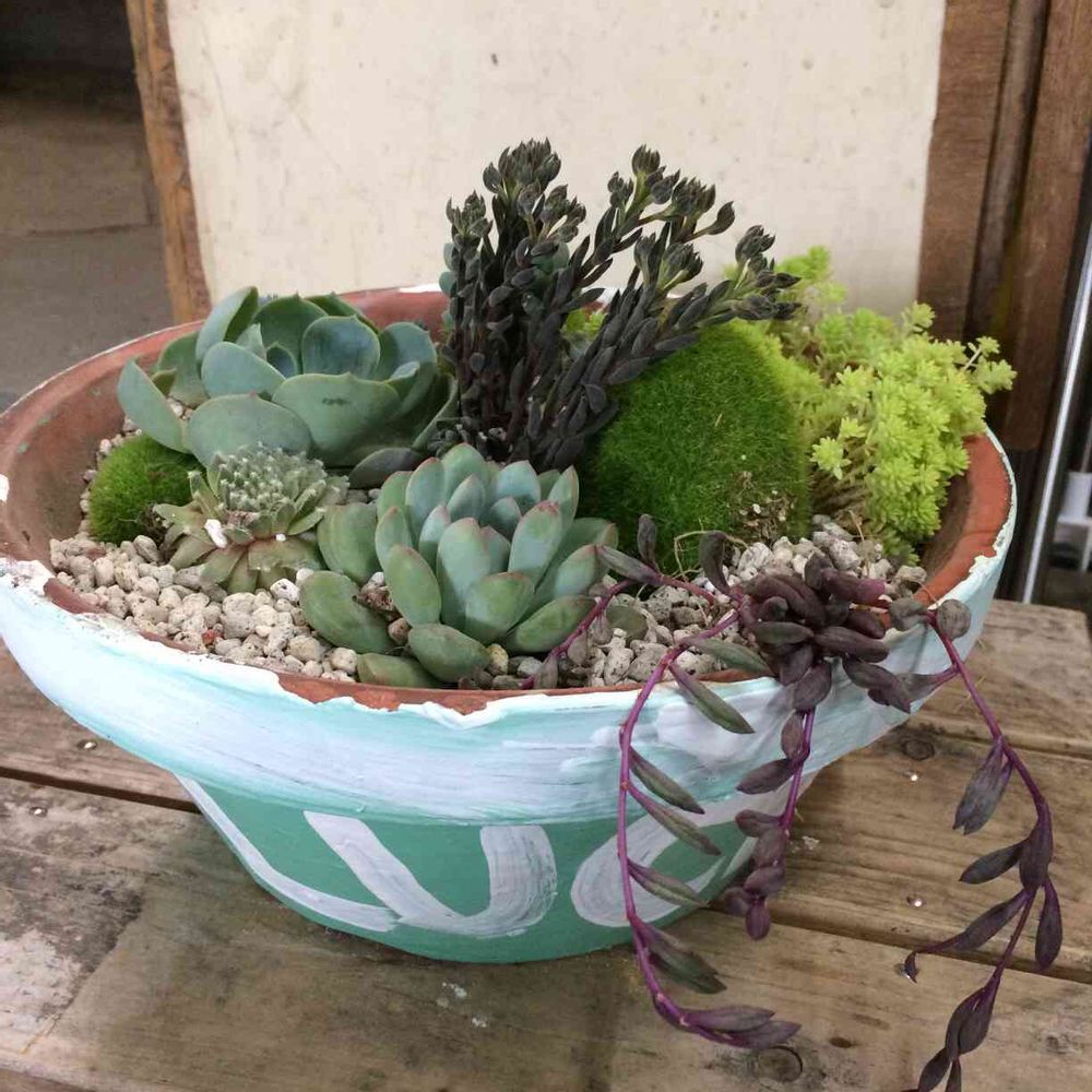 器にはLUCKYとHAPPYって書きました。100均で買ったフェイクの苔玉も彩りにしました