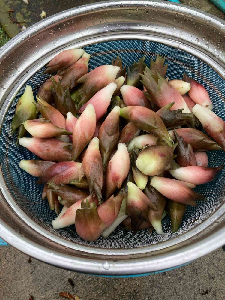 今日は家の裏のツゲ(伸び放題😅💦💦)やツツジ(これもまた伸び放題😅💦💦)の剪定をしながらツゲの下にある茗荷(ミョウガ)を収穫してゴミを取りながらきれいに洗ってザルで水きって、明日おばちゃんのデイサービスに持たせる予定で〜す😁🤗