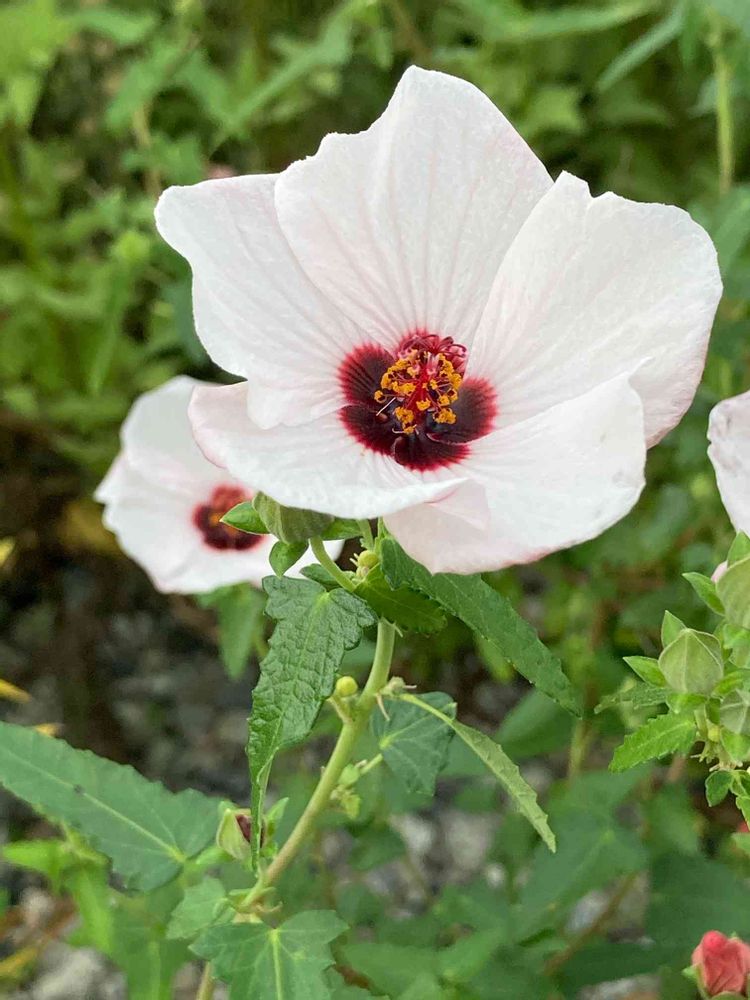 スミマセン。お花の名前間違ってました。やよいさんのご指摘により、ヤノネボンテンカまたはタカサゴフヨウと訂正します。ギンセンカは葉っぱに切れ込みがいっぱいありますが、こちらは矢尻のような形をしてます。よろしくお願いします🙇♀️🙇♀️🙇♀️