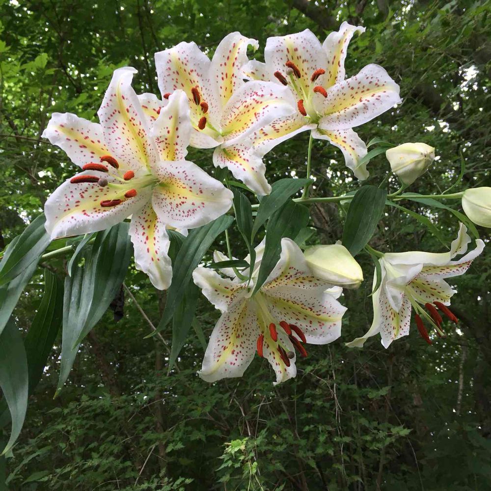 茎全体が花の重さで傾いています。白色の花びらに黄金色の筋に赤茶色の斑点。
