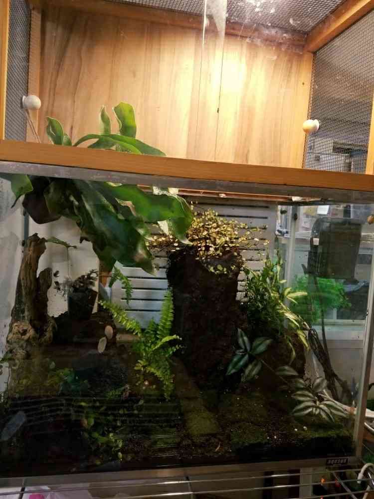 カエルを捕まえた→カタツムリも捕まえた→沢山捕まえた→プラケースに入らない→水槽に入れた→高さが足りない→爬虫類ケージを上に足した→ポットの植物を置いた→手入れが面倒→固まる土に植え込む→苔を置いた→ライトを付けた→餌を買った…