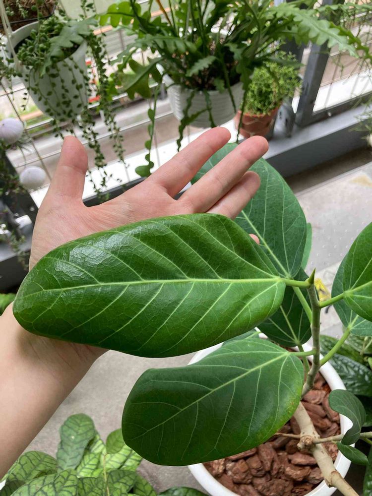お部屋の中にずっといて太い幹にほどよい小ささの葉っぱだったのにここ数日ベランダに出していたらなんとこんなに…