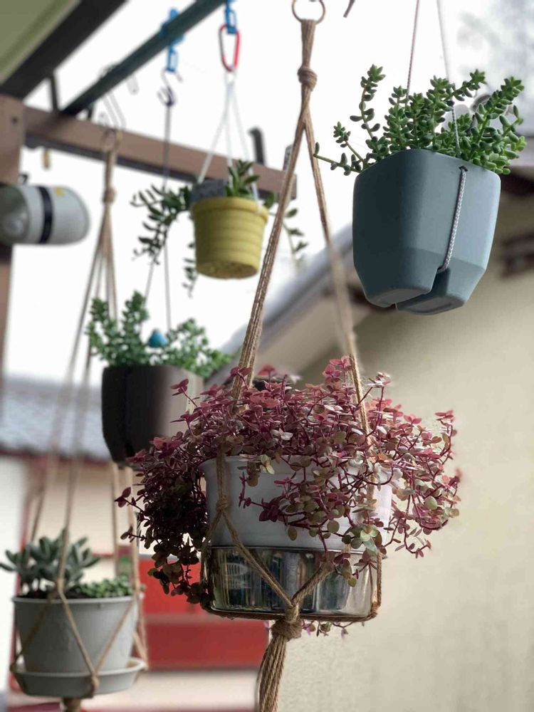 カラフルな鉢にいろんな多肉さん♪空中植物園みたいでいいですね✨
