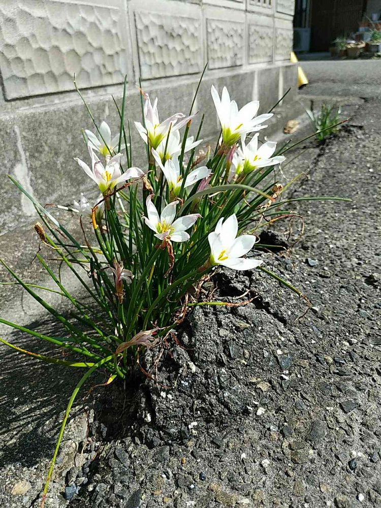 硬いアスファルトをモコモコと盛り上げて、タマスダレの花が咲いていました。
