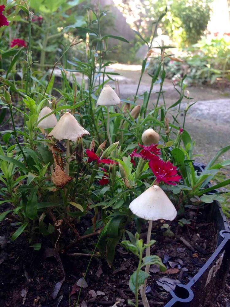 あららら〜見て下さい。長雨で庭の隅にキノコがにょきニョキ