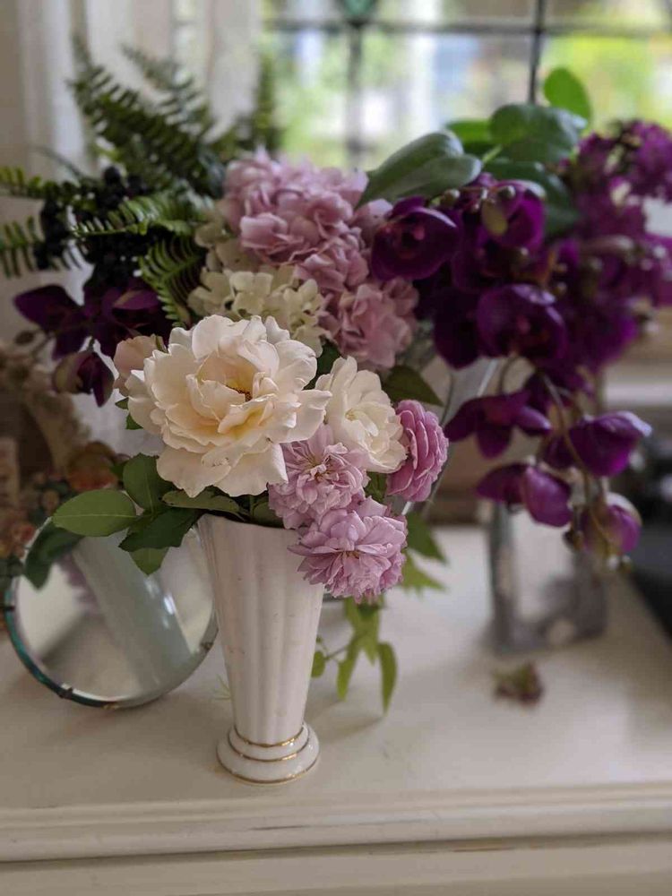 薄紫のフェイクフラワーが薄いピンクの薔薇を引き立てて、とても絶妙な感じがします〜お花を作るのも素晴らしいですが、いけるセンスもまた素敵です💗🌹💗🌹💗