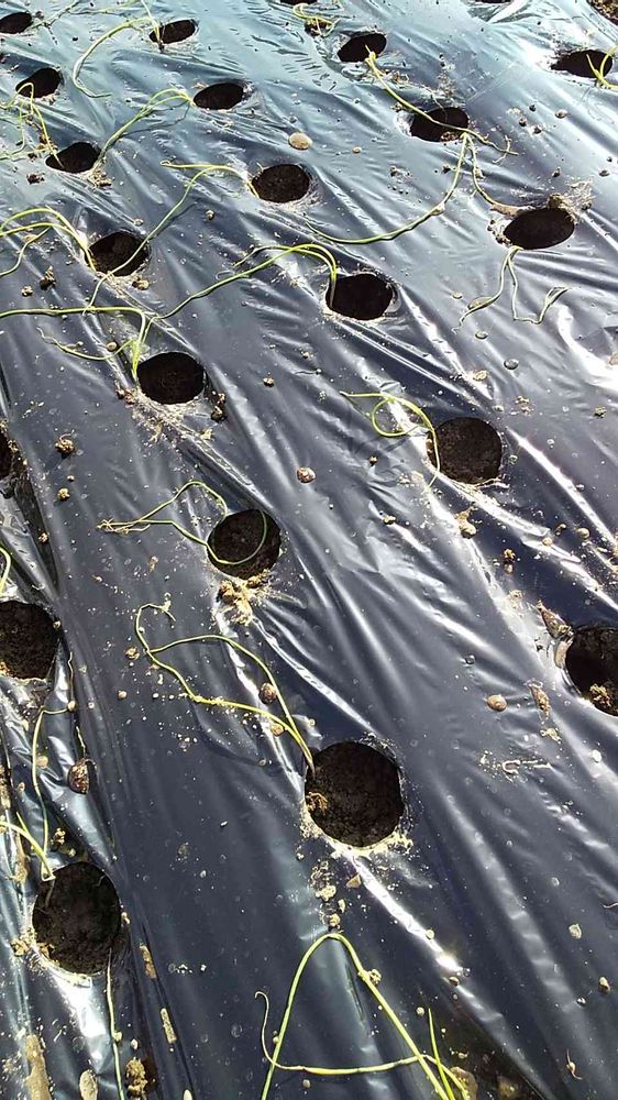 ポットから出した苗を師匠が1本ずつにバラし、マルチの穴の近くに置いていきます。それを私が穴の中に植えるのです。