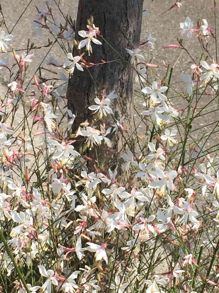 会社の帰り道の街路樹の傍らでガウラの花が咲いていました。この花はかれこれ半月以上も咲いていました。息の長い花ですね。