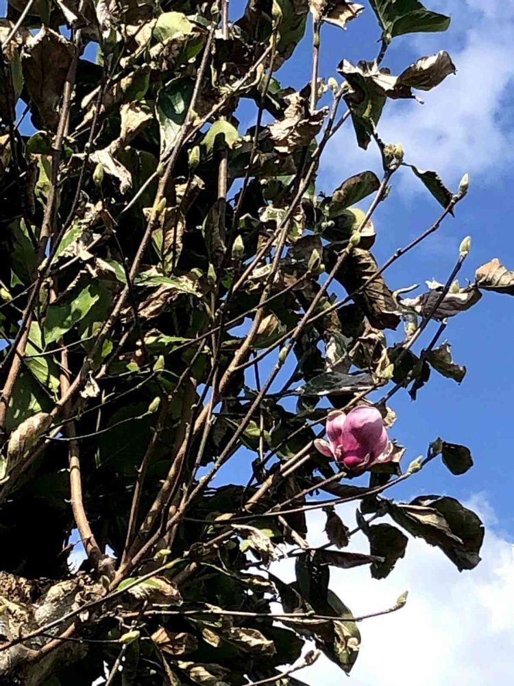 先月の台風で葉っぱ🌱はヨレヨレですが、木蓮か1輪だけポツンと咲いてました。