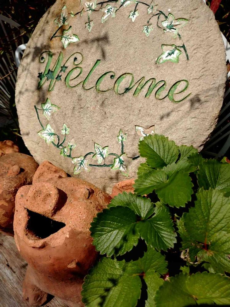 植えっぱなしのピンクの花を咲かす苺ちゃん❣️元気な葉っぱとぶたさんがお散歩園児に大人気🐷