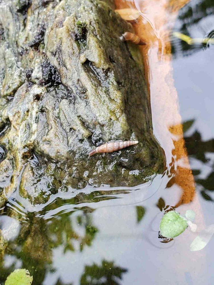 昨日ビオトープの葦を刈り、藻の掃除をしていたら、植木鉢ドームの上の石の下からキセル貝が出てきました!
