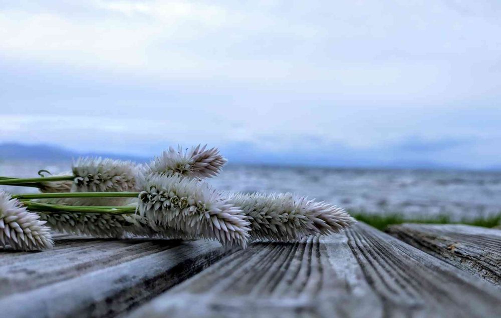 琵琶湖と摘んだお花をベンチ越しに撮ってみましたよ。