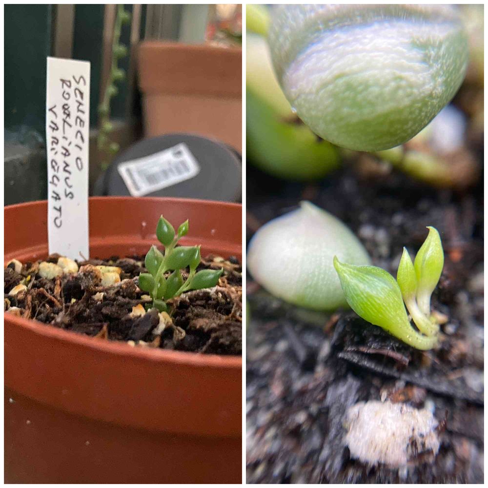 左はこの夏全滅したと思われた斑入りグリーンネックレスの復活、その名も立ち上がりグリーンネックレス😅 横に広がらず上に伸びていく😅