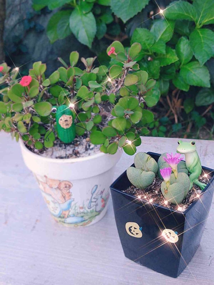 むっちりのコノさんのお花を眺めているコポたん🐸と ミルさんの 落花生の🐸で 参加します♥