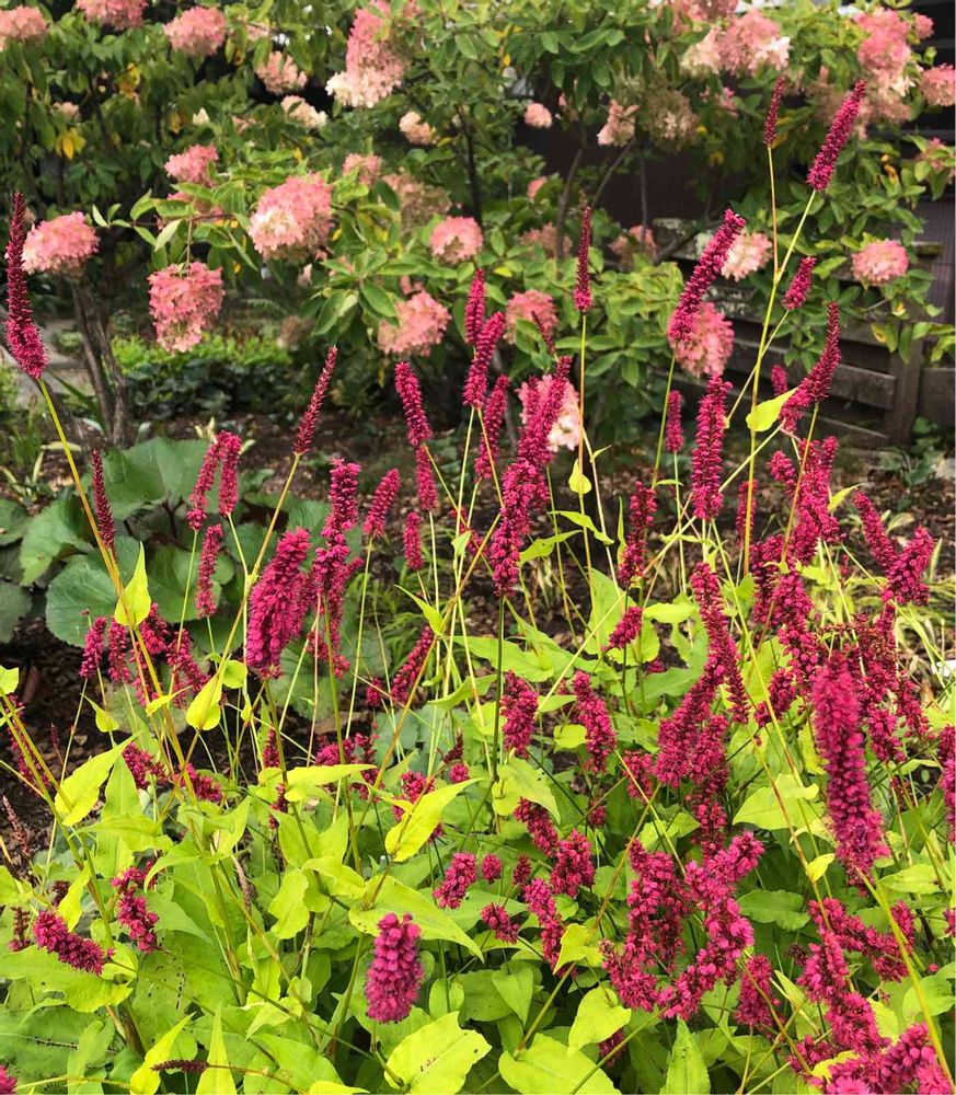 ペルシカリア、先日お迎えして、アナベルの手前に植えました。黄金の葉に小豆色の花、コントラストが素敵ですね✨