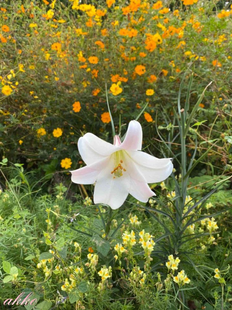 コスモスと、リナリアに囲まれ、高砂百合が咲いてます
