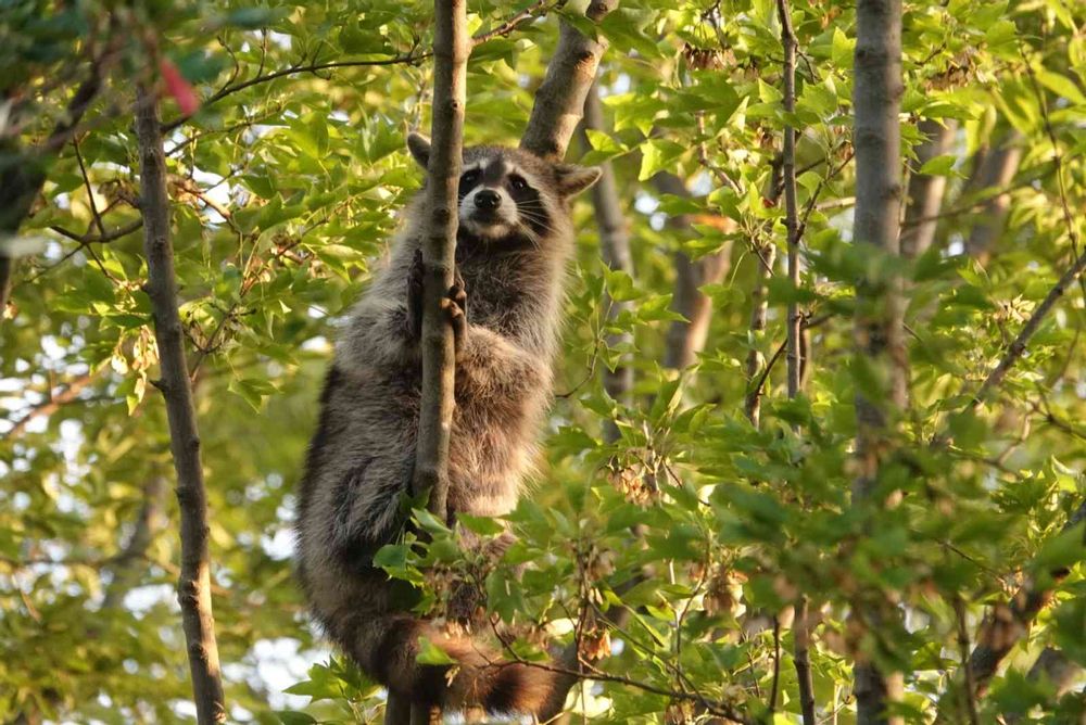 何かあったのかな、と見上げるとトウカエデの木の高い所にアライグマが!